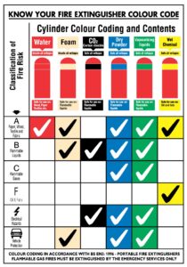 This handy graphic shows you exactly what type of fire each extinguisher can be used on. If you’re not sure or if you have specialist risks such as flammable metals, please get in touch for details of our risk assessment & fire extinguisher selection service.